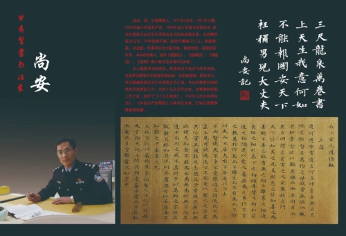从小酷爱书法的尚安,既是单位小有名气的书法家也是单位警营文化建设的推动者,他积极进取、勤奋学习,多次圆满完成全市公安系统文艺汇演、书法比赛等活动的组织导演策划工作。党的十九大召开以来,在繁重的执勤工作之余,创作了《十九大报告》《中华人民共和国宪法》《中国共产党章程》小楷书法长卷已被甘肃警察博物馆收藏。